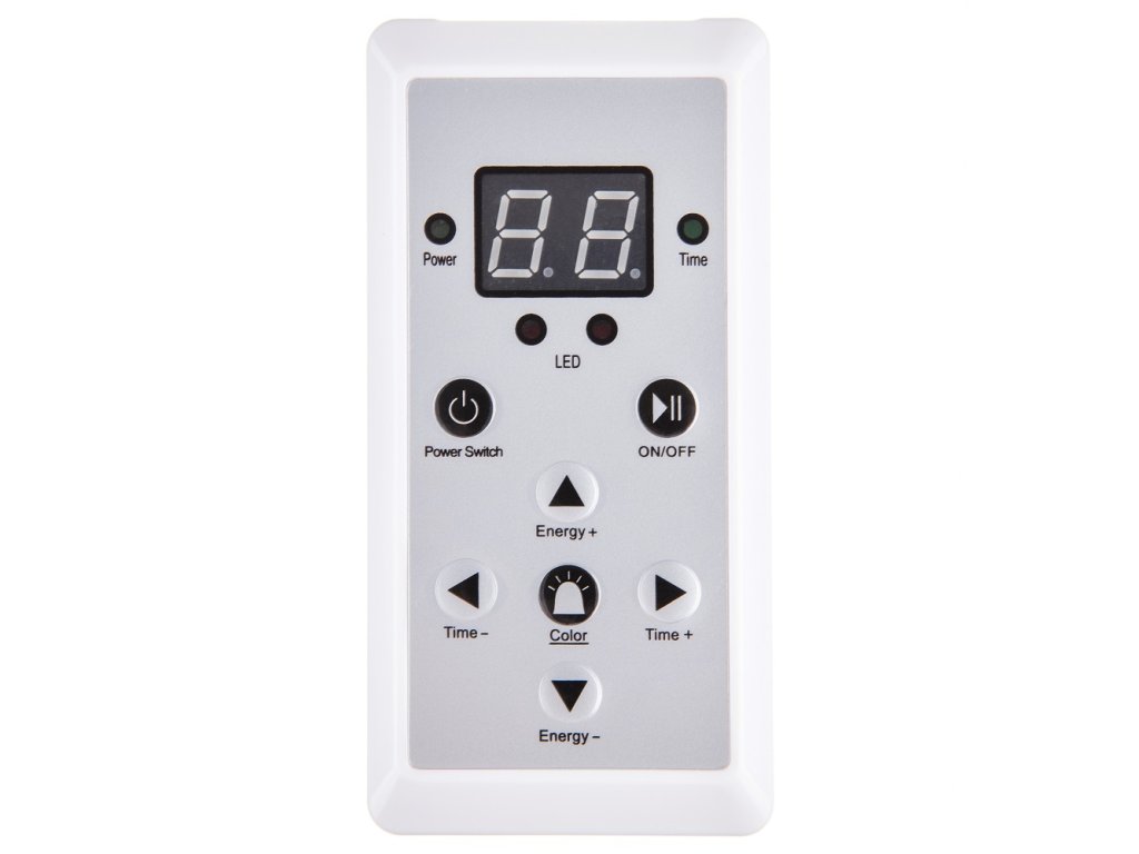 Na ovladači nastavte intenzitu (1–10), barvu světla a dobu ošetření (doporučeno 10–15 min).