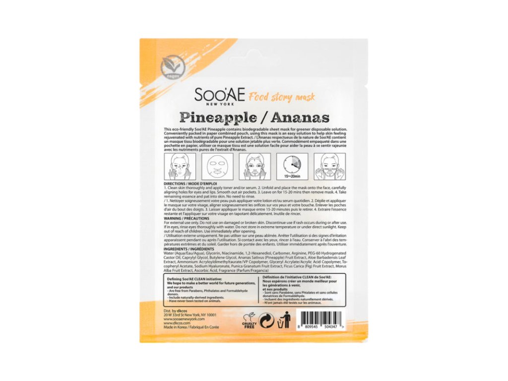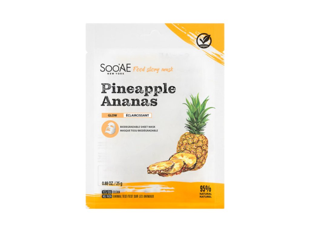 Rozjasňující veganská textilní maska s extraktem z ananasu, vitamínem C a E navrací pleti zdravý jas, podporuje regeneraci a zanechává pokožku hladkou a svěží.