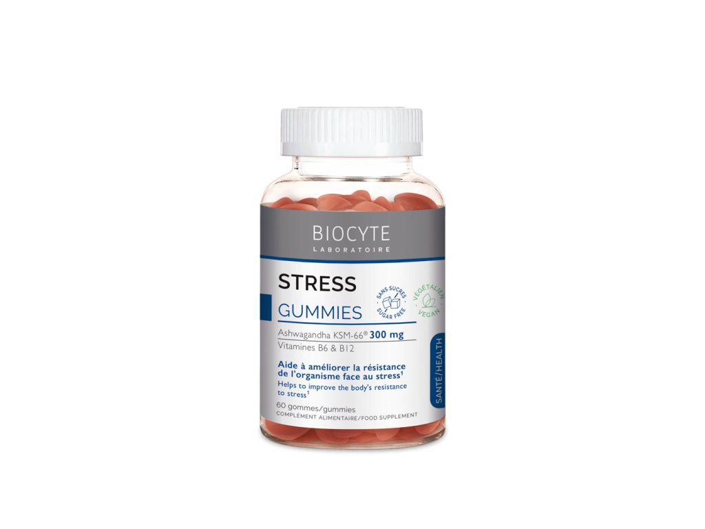 Extrakt z kořene ashwagandy (300 mg, 5 % vitanolidů), vitamin D (5 μg), vitamin B6 (1,4 mg), vitamin B12 (2,4 μg), sladidla (maltit, sorbit), voda, kyselina citronová, želírující látka (pektin), maltodextrin, citronan sodný, barvivo (antokyany), kokosový olej, přírodní aroma, karnaubský vosk. Bez cukru. Bez GMO.